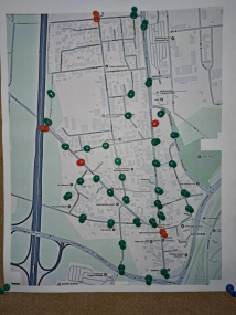 Alle freiwilligen Helfer wurden entsprechend an den Brennpunkten im Ort eingeteilt (grüner PIN) und die Müllsammelstellen entsprechend aufgezeigt (roter PIN).