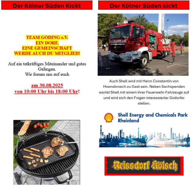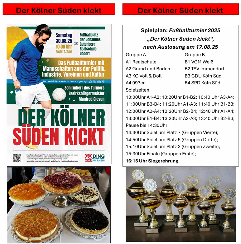 Am 30.08.2025, bei durchweg tollem Wetter mit 24 Grad, mit kurzer einmaliger Abkühlung von oben, fand unser Fußballturnier 2025 "Der kölner Süden kickt" statt. Es traten neben dem Turniersieger an, die Mannschaften der Realschule, Karnevalsgesellschaft Voll & Doll, 997er (Migrantenwohnheim), Vereinsgemeinschaft Weiß, TSV Immendorf, CDU Köln Süd und Team Burmester SPD Köln-Süd, an. Es konnte nur einen Gewinner geben, unsere Gemeinschaft, das war die super Atmosphäre und das wirklich tolle Miteinander in unserem Godorf. Wir bedanken uns nochmals bei allen Besuchern, Turnierteilnehmer, Helfern und Sponsoren für die Unterstützung. Ein besonderer Dank geht an die Feuerwehr der Shell für die Unterstützung. Wir hoffen mit unserer Aktion, den Wünschen der Godorfer entsprochen zu haben. Der Helferdankeschöntag ist für den 25.10.2025 im Pfarrheim vorgesehen. Bilder (eine Auswahl) zum Turnier sind in der Galerie eingestellt. Wer mehr Bilder haben möchte, kann diese von uns gerne erhalten.