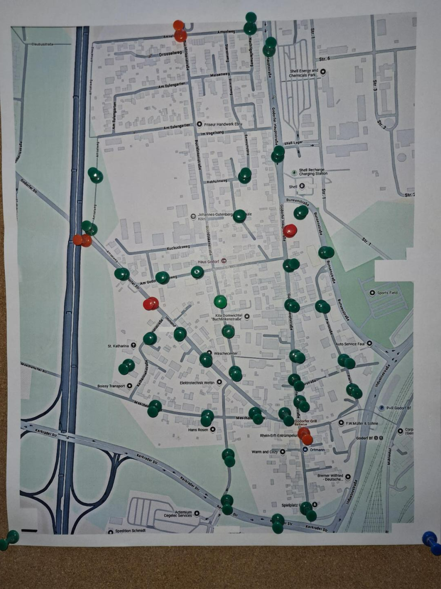Ebenfalls soll an der Bunsenstraße ein ausreichend beleuchteter Fuß-/Radweg gebaut werden, da dieser bislang fehlt. Das würde auch den Mitarbeiterparkplatz der Fa. Shell auf dem ehemaligen Fußballplatz des SV Godorf attraktiver machen und das Abstellen von PKWs der Mitarbeitenden von der Fa. Shell in den umliegenden Straßen und Grünanlagen eindämmen.“