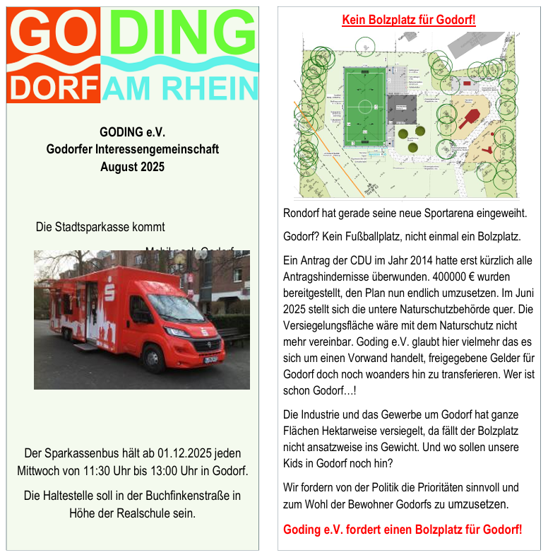Goding e.V. hat sich bereits auf der letzten Vereinsgemeinschaftsversammlung entsprechend angeboten. Ziel der Sache ist es, auch Bürgerinnen und Bürger in Godorf mitzunehmen, welche in keinem der bisherigen Vereine Mitglied sind und sich trotzdem für Godorf einsetzen wollen.