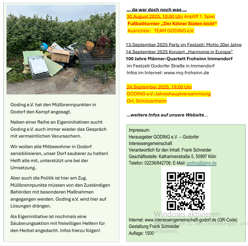 Sicher noch kein Durchbruch, aber gemeinsam können wir den Druck auf die Verursacher erhöhen, wenn wir gemeinsam wachsam sind. Das Thema "Müll" hat sich unser neuer Oberbürgermeister Thorsten Burmester auf die Fahne geschrieben. Wir werden ihn darauf hinweisen, das dies ein großes Problem in Godorf ist.