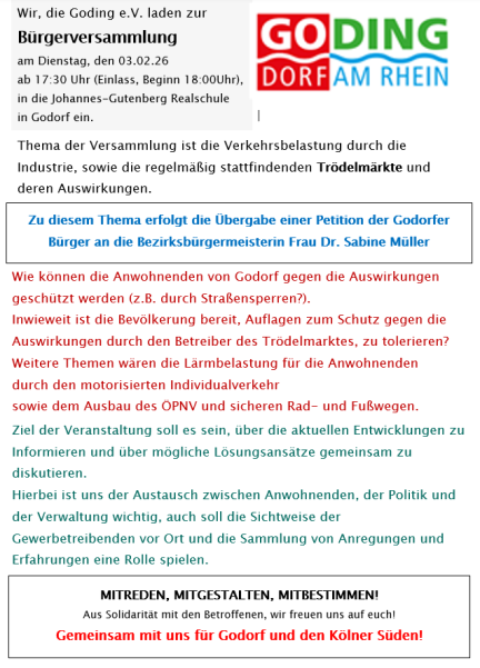Der Godorfer Karneval lebt. Goding e.V. ist über mehrere private Karnevalsfeiern als "Afterzochpartys" in Godorf informiert worden, diese finden wie immer in den "Katakomben" der jeweiligen Karnevalsvereine statt. Ein gutes Zeichen, das der Karneval in Godorf weiter gelebt wird, schließt euch an und informiert euch...